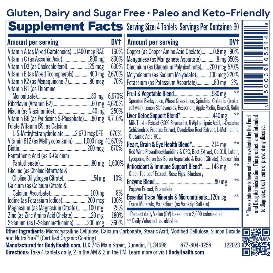 Packs nutrition from organic fruits and vegetables plus methylated Bs, chelated minerals, antioxidants, and CoQ10 into a simple 2-AM / 2-PM routine that supports heart, brain, liver, immune, and stress resilience.